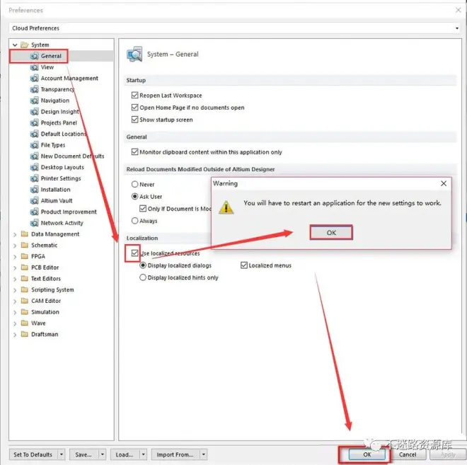 17.选择“General”,再选择“Use localized resources”,点击“OK”,再点击“OK”