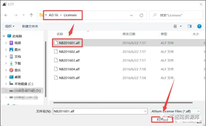 14.找到“AD 16”解压后的文件夹路径,打开”Licenses”文件夹,随意选择一个文件 ,点击”打开“