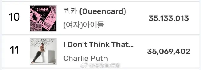 讽刺的是,《Nxde》又被说成是吃了《TOMBOY》的红利,反正在(G)I-DLE的身上,就不能有正常的成绩和成长,只要她们拿好成绩,反正就是用了歪门邪道,毕竟小公司的女团不该赢过大公司女团,于是到了《Queencard》优势同样的情况,该曲的成功被说成是土到极致就是潮,反正就是不承认(G)I-DLE的强大。