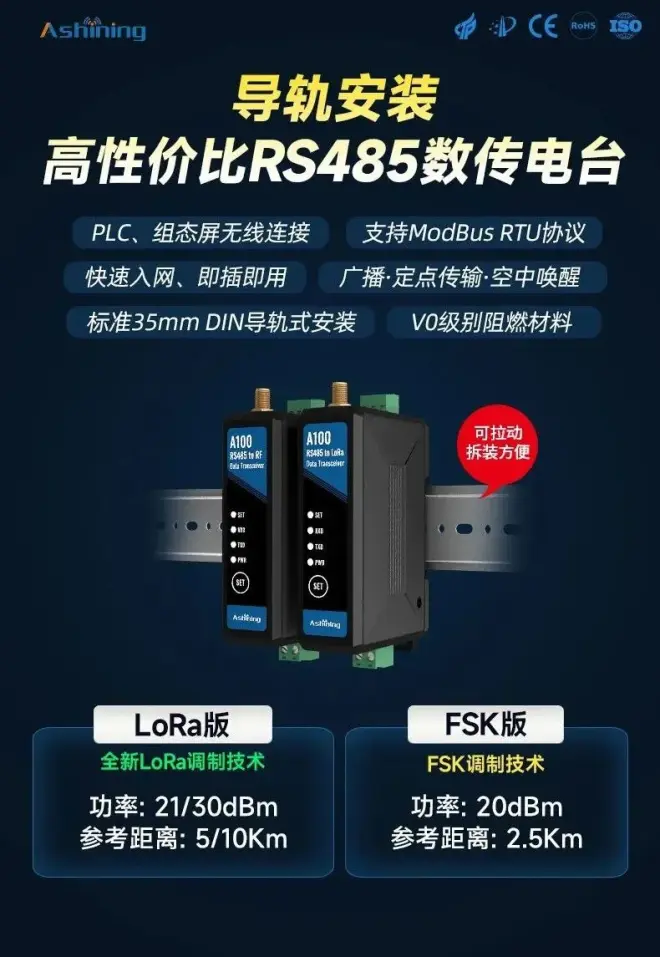 泽耀A100系列导轨型DTU,一款高性价比RS485数传电台。电台采用LoRa扩频技术,采用了高效的循环纠错算法,编码效率高,纠错能力强,V0级别阻燃材料,经过在低温-40°C和高温85°C工作环境测试,保证安全、稳定、抗干扰。