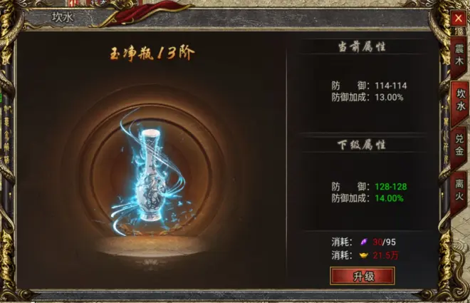 玉净瓶-提升防御以及防御加成百分比,升阶时需要使用坎水精华和元宝