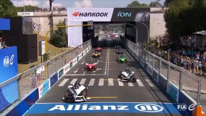 罗马站第二回合正赛在周日北京时间晚上21点03分开始。所有赛车就位,后场清空,五盏红灯亮起。灯灭!FE电动方程式罗马站的比赛正式开始!