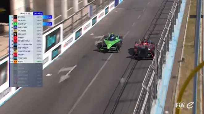 第二十二圈,埃文斯强势超越丹尼斯,抢回第一。此时丹尼斯的电量并不占优,比前后的几位车手都要少百分之二,他连续被卡西迪(Nick Cassidy)和冈特尔(Maximilian Guenther)过掉,掉到了第四位。