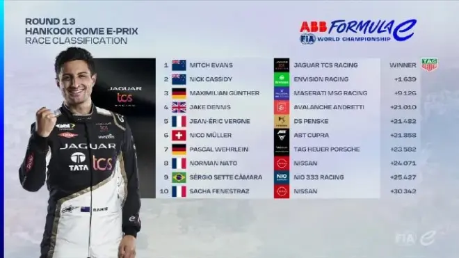 回到前方阵营,捷豹TCS车队的埃文斯第一个冲过终点线,夺得FE职业生涯的第四个罗马站的分站冠军。