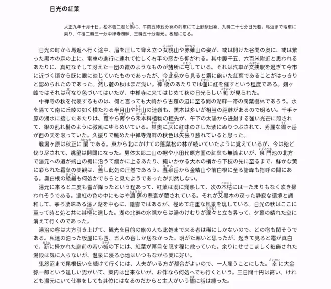小序:大正九年十月十日。与松本善二君同乘列车于上午五点零五分发车,从上野站出发,九点二十七分到达日光。乘电车到马返,下午两点半在中禅寺湖畔,三点五十去了汤元*1。最后在一处板房下榻。