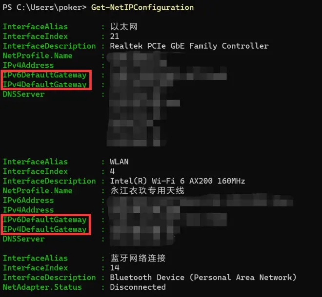 接下来使用Get-NetIPConfiguration指令,就可以看到物理网卡的信息了: