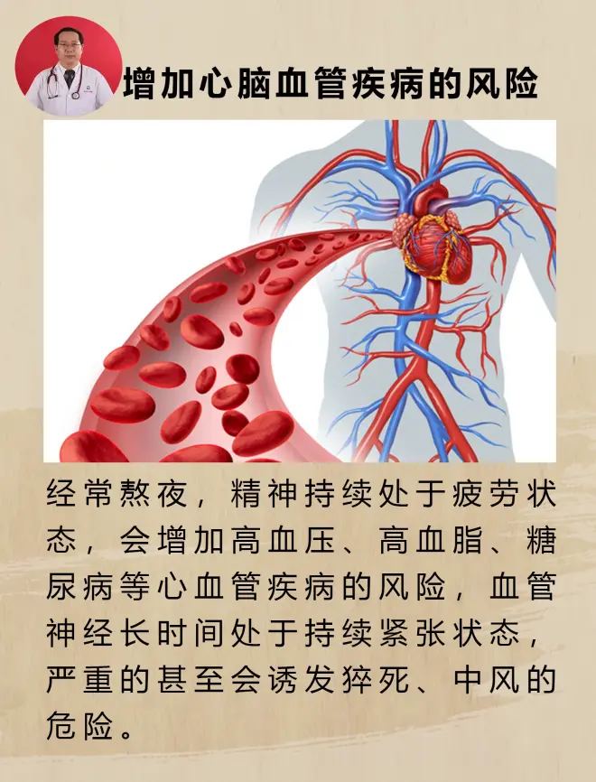 3、增加心脑血管疾病的风险:经常熬夜,精神持续处于疲劳状态,会增加高血压、高血脂、糖尿病等心血管疾病的风险,血管神经长时间处于持续紧张状态,严重的甚至会诱发猝死、中风的危险。