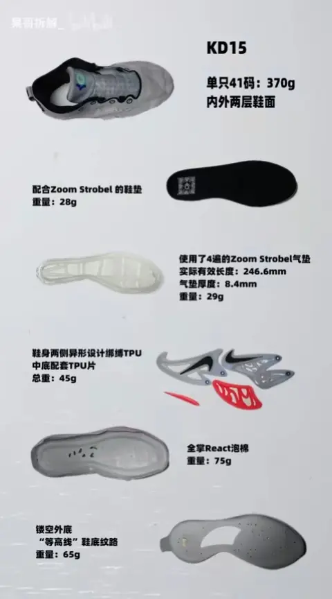 这次采用的鞋底纹路让我想起了科比9代,鞋前段两侧也都有上翻纹路,抓地在室内塑胶场地稳得一批,好多耐克球鞋刚下地摩擦地面没有声音,得磨合一下,KD15在地上蹭两下吱吱吱的声音就出来了,非常悦耳,等改天去木地板试试,纹路比较软,感觉不太耐磨,抓地这次我很满意,非常棒!缓震本人180斤,属于3d球员吧,以投篮为主,刚上脚就能感觉到气垫的回馈,前掌能明显感觉到气垫的弹性,后掌能感觉到气垫和react泡棉双重缓震,后跟缓震更舒服,但是整双鞋的重心稍微有点高!