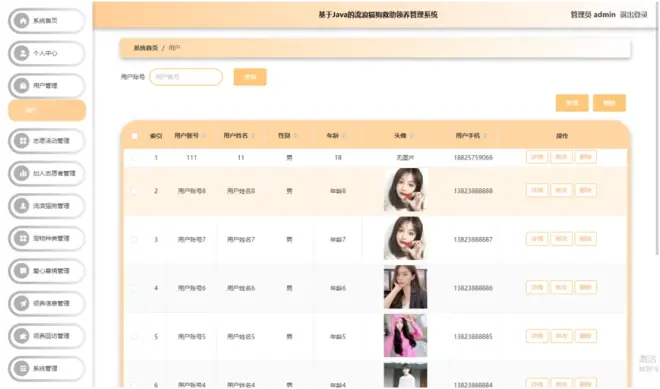 管理员点击用户管理。在用户页面输入用户账号进行查询、新增或删除用户列表,并根据需要对用户详情信息进行详情、修改或删除操作;如图5-7所示: