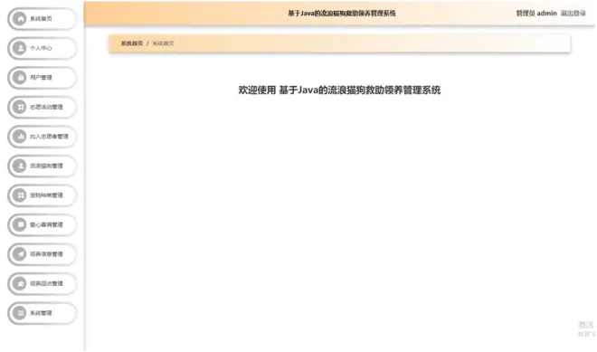 管理员进入主页面,主要功能包括对首页,个人中心,用户管理,志愿活动管理,加入志愿者管理,流浪猫狗管理,宠物种类管理,爱心募捐管理,领养信息管理,领养回访管理,系统管理等进行操作。管理员主页面如图5-6所示: