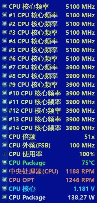 您好,up,我这个是1360kf+z790-p,大霜塔散热,用的先马黑洞的静音机箱,默认bois设置,核心频率很稳定,温度不超过80°,功耗最高141w,核心电压(1.18~1.19),温度达到79°的时候有偶尔掉帧现象。请问,这个数据咋样?感觉电压好低,没上过1.2,还有就是我两个风扇的转数为啥不一样,默认状态下差300左右,opt的风扇转速变化不大?