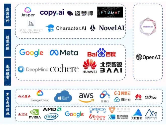 3)模型优化与改进:这个阶段主要包括将模型进行行业化改造,提供API接口或改进后的模型。实际上,这个功能可能由产业链中基础模型研发环节或者下游的应用软件层来完成,目前还没有看到专门从事这个环节的公司。