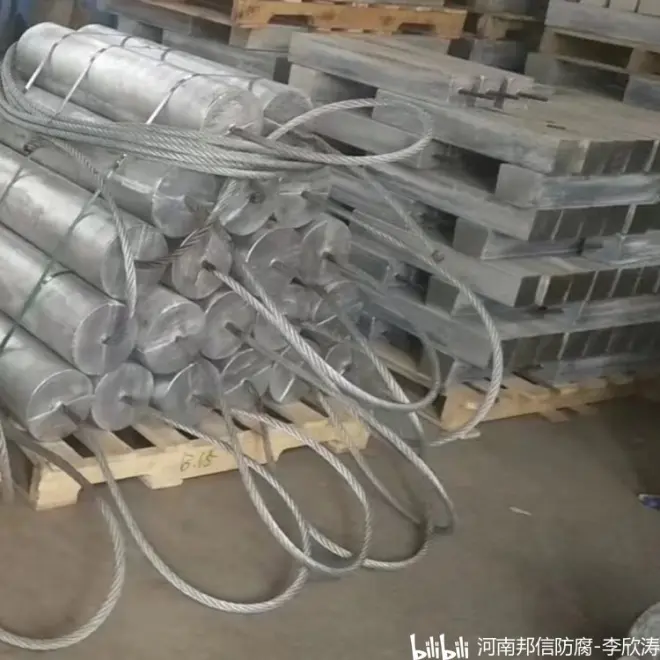 镁阳极通常是加入铝、锌、锰的镁合金。必须保持非常低的镍、铁、铜的含量,因为它们促进自腐蚀。如果镍的含量超过百分之0.001,就损坏阳极特性。铜的影响不是太明显。铜会增加自腐蚀,当含量达到百分之0.05时,如有百分之0.3的锰,则没有有害影响。铁含量大概在百分之0.01时,假如锰含量超过百分之0.3,不会增加自腐蚀。加入锰时,由于锰的覆盖而形成铁的晶体,这样铁从熔融状态沉淀下来固化时不会产生有害影响。加入锌可以使腐蚀性侵蚀更均匀,而且抑制了其他杂志的敏感性。镁合金阳极电位负,单位质量发生电量大,是理想的牺牲阳极材料。适用于土壤、淡水及海水等介质中的金属构筑物的阴极保护。镁合金牺牲阳极按国标GB/T17731-2004镁合金牺牲阳极生产,用于管道的阳极同时符合SY/T0019-97埋地钢质管道牺牲阳极阴极保护设计规范。