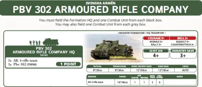 升级备注:①每个P-SKOTT m/68AT班组花费一分,升级成为P-SKOTT m/86AT班组。②将一个Grg m/48AT班组替换为RBS-56BII.L反坦克导弹班组【热成像】,并为其每个增加一分。