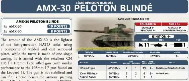 说了比较多常见老熟人后,也顺便说下北约其他乐子人阵营,三战法国被BF多次背刺,数次被插队已经就见怪不怪了。但是拿着早几个阶段的书,来组军的法国,某些单位其实还是上乘的好用的。除了上文简略的看了下法国VAB摩步排,这里要对照的是AMX系列车,因为,分段和功能我都把她们归一类就是廉价反甲单位装备类别里面的。一样是8-10分这个区间,AMX-30明显的则是当初还是有4+被弹以及4车人均3+技能,2/1射速的整体优势在和AMX-10RC,9分有着上述属性,自带【侦查】【矛头】,当然除了在19穿面前都是跟纸一样这个比较致命的缺点外也没啥可怕了。