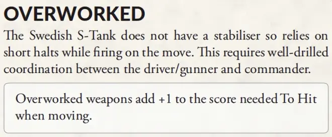 拥有【过劳】词条的武器,在单位班组移动后,射击难度+1。