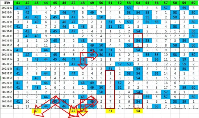 号码47当前遗漏7,是最近一个月来的遗漏峰值纪录,也是夹号,是双斜连(45-46-47)和(49-48-47)的汇接号。