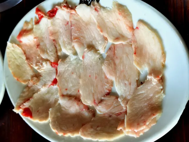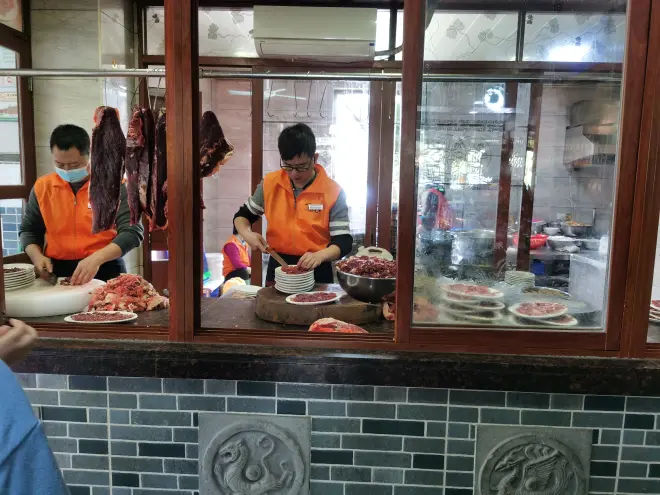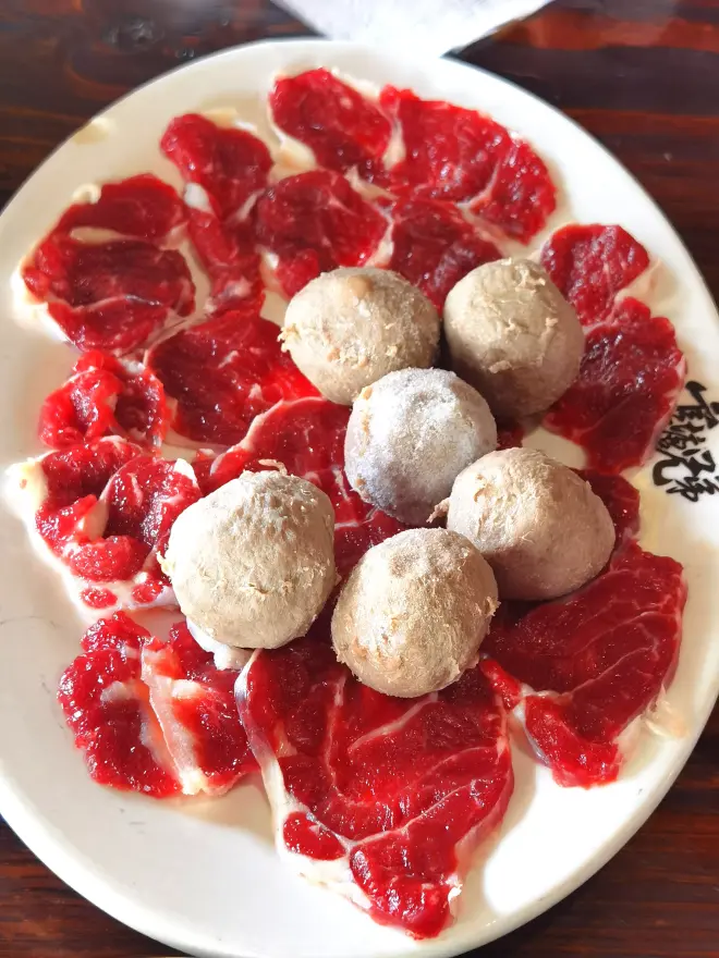 中午去吃官塘兄弟牛肉,这家店我们做了好久攻略,是这趟旅程必去的地方,查了下导航十几公里,心想还好,我们有电动车加持,结果就是这一路比较神奇,从市区去吃饭的地方十三公里远,我们骑着租的电动车一路走,越走越偏,路边层叠出现了香蕉林、菜地、杨桃林、荒地。。。只有十几公里的路,荒凉的让我们很担心会回来的时候电动车缺电,这段路骑了接近五十分钟,终于接近目的地,看到一个镇子,悬着的心落下来了;相隔不到二十米的距离有两家官塘兄弟牛肉店,心想这两家莫不是一家?这么近的距离如果是盗版肯定会被打趴,我们去了路口的一家,我们到的时候中午十二点十分,正是饭点,这里车早已塞满,隔着店门和窗户看到里面坐满了人,火急火燎的去占座,我们运气不错,正好还有一个空座,桌上锅底已经有了,锅底是简单的牛骨汤,白萝卜垫底,加了白胡椒,不需要单点,收费二十元,我喝了一碗,烫了舌头,没有咸淡味;点了吊龙肉、三花趾、嫩肉、牛百叶、牛肉丸、雪花肉、胸口朥(其实还想点五花趾、牛肠,奈何缺货,服务员说五花趾一头牛就出几盘,早卖完了,只能感叹没口福)肉都是29一盘,本来点个青菜,菜单里没有,问服务员,说每桌送一筐素菜,里面有娃娃菜、圆生菜;肉不是一次性上齐的,需要现切,嫩肉可能还要腌一下,我看到嫩肉上有花生油在润,先上的是三花趾、牛百叶和吊龙,把牛肉丸先下进去煮,拿笊篱烫肉,每样肉烫的时间均不超过十秒,肉刚刚变色火候刚好,肉足够新鲜,牛肉口感入口就是一个字嫩,三花趾和牛百叶还带着脆,牛肉丸是脆,蘸着自己调制的料汁,确实是我们在别处吃不到的美味,不枉我们曲折的这一路,绝对不虚此行,吃到剩两盘肉,觉得缺点主食,问服务员有没有粿条,想把粿条下到锅里自制个牛肉粿条汤,服务员说没有,有牛肉炒粿条,我们翻了翻白眼,咋就不能给我们一份自己煮呢?点了一份牛肉炒粿条39元,因为吃了我们自己烫的牛肉,觉得粿条里的牛肉炒老了,口感渣渣的,然后粿条油挺大的,缺少锅气;总结这家店真的非常非常火,我们坐下后面开始排号,到我们吃完,已经排到了二十七八号,他们家翻台足够快,我们两人这一顿花了239元,牛肉、牛百叶、牛肉丸非常非常好吃,嫩肉和吊龙切的稍微有点连刀,但不太影响,肉我们点的有点多,感觉三四个人也能够吃,性价比非常高,如果在别的地方吃,感觉没有四五百拿不下;吃完我们出来才发现我们去的是官塘兄弟牛肉店二分店,隔了十几米的地方是总店,妈耶我们一直以为那边是个市场,露天的院子摆了几十张桌子,坐满了人,每桌点的都差不多,气氛那叫一个热烈,我们穿心而过感受了一下,顺路瞅瞅有没有我们没吃到的,幸亏是牛肉火锅,食材品质、刀工相同的情况下味道相差不大,也感受到了大几百人同时吃火锅的浓烈气氛,所以没有遗憾。