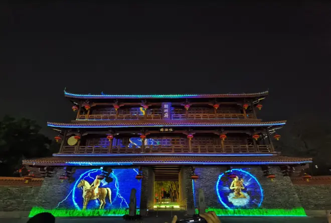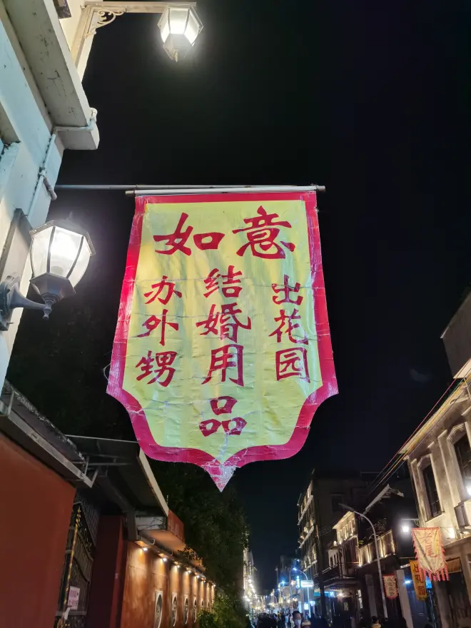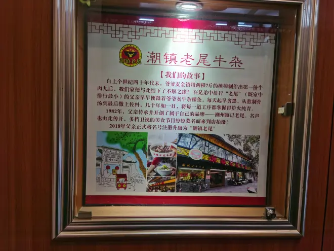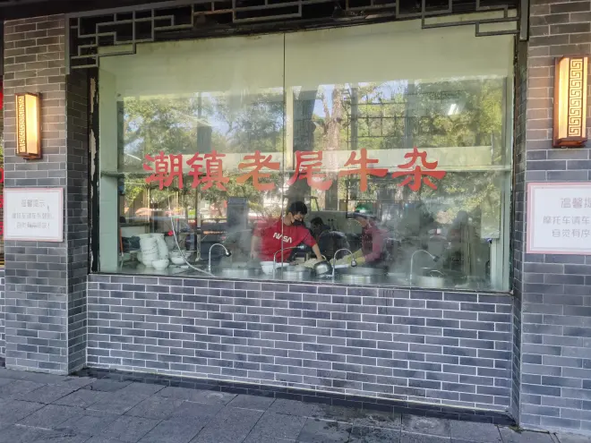 逛着逛着到了傍晚,路上吃了上面那些小吃,确实没有感觉到饿,决定晚上一路走一路吃点小吃,遇到一家卖炸腐乳鸡翅的,叫府城腐乳鸡翅,看到前面有四五个人排队,心想不用等太久,我们也去排队买了,25一斤,买了两个花了20.7元,店门口有凳子,我们坐凳子上开啃,鸡翅就是炸鸡翅,应该是面糊中兑入南乳汁,我们买的这俩糊没挂住,鸡翅没腌进去味道,重点是翅根有点坏了的味道,不推荐,店员给了蘸料,里面有辣椒和椒盐面。。。不知道是不是错觉,我们买完队伍瞬间排的好长,好多排队的问我们好吃不。。一边啃一边觉得尴尬,草草啃了几口落荒而逃;接着去看了潮州古城的灯光秀,晚上八点到八点半在观海楼有一场,灯光秀是在城楼上立体投影呈现的,时长五分钟,后边是循环播放,广济楼那九点十五也有有一场灯光秀,但是当天预约不到,就拍了个城门掠影;城门楼不远处有一卖现烤肉脯的,叫忆湘子鲜烤肉脯,十块钱一串,一串两片肉脯,感觉新奇买了一串,肉脯是普通猪肉脯,烤过之后带些焦香味,广式肉铺偏甜,看个人喜好吧,我们还是不太习惯;接着去买了古城卖的最多的饮品之一油柑汁,油柑汁在古城中每条巷子都有售卖,价格却差别巨大,需要好好甄别,我们见过的有十五元一瓶的,有十二元一瓶的,有十五元两瓶的,我们买的十二元两瓶,后边更是遇到了五元一瓶的,不知道区别在哪,都是店家自己罐装的,没有密封,喝着口味淡淡的清香,有些青柠的感觉,适合吃的油腻后清清口;继续游逛,古城大街小巷有特别多的牛肉丸店,我们之前在大众点评上找过潮州当地的牛肉丸,快递回北京,感觉挺好吃,这次是想来产地尝尝与之前买的有什么区别,在一家叫潮客隆牛肉丸的店买了一碗,一碗十块钱,牛肉丸一直在锅里煮着,有客人来就捞一碗,一碗好像是六颗吧,记不清了,口感比我们快递的差一点,没有那么弹牙,牛肉味还是不错的,汤是牛骨汤熬的,能品出来,整体而言是个不错的小吃;逛到晚上九点半,可能因为我们一直吃的小吃,也可能是我们饭量大,感觉肚子里还是欠欠的,遇到一家卖红烧牛杂的,之前在别的地方吃过阿婆牛杂,感觉很好吃,这次遇到也买一碗尝尝,店名叫香顿牛杂,要了一碗小碗的牛杂,三十元,白萝卜垫底,牛杂、牛肉铺上,牛杂和牛肉量不少,我们在店门口的凳子上坐着开吃,撒上香菜和辣椒酱,牛杂吃起来很有口感,百叶和牛肚脆脆的,牛肉软烂入味,萝卜煮的很透,广东这边白萝卜都非常好吃,不管是昨天的鱼生配菜还是牛杂里的白萝卜,都特别甜,还没有筋,非常赞,这家牛杂不错,我们可能特别能招揽客人,我们坐下后来买牛杂的排起了队。。。。下次哪家店想生意火爆可以考虑找我们当托,哈哈哈,光顾着吃牛杂忘了拍照片。。。顺便说一嘴,潮州这边好多字咱也不知道是写错还是怎样,看起来怪怪的,像这个香顿,还有一个横批的呈字在我们看来也是错别字。