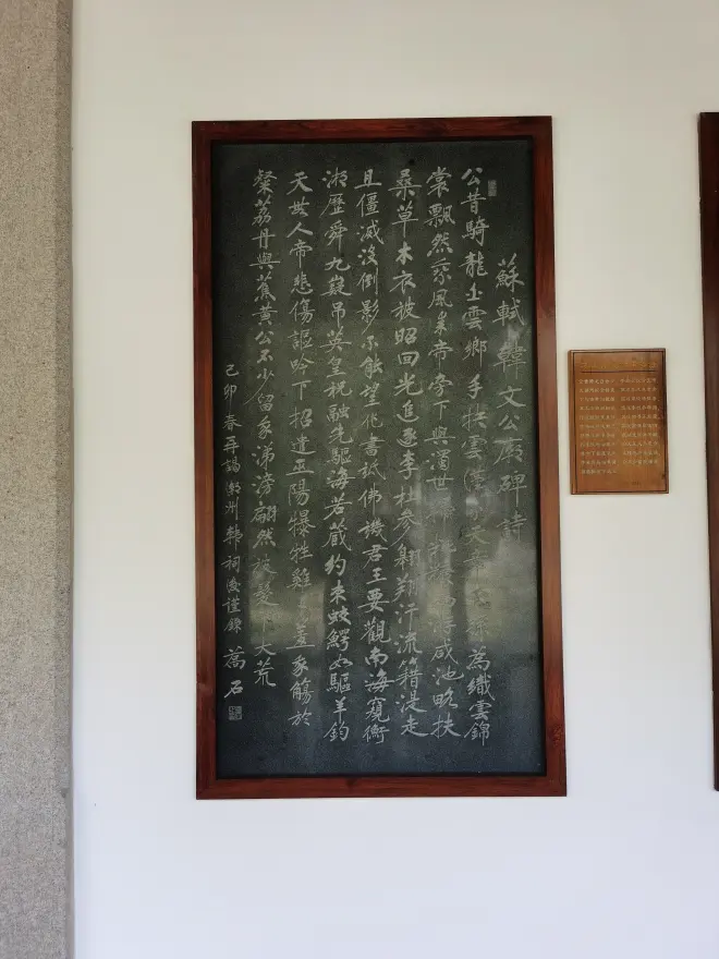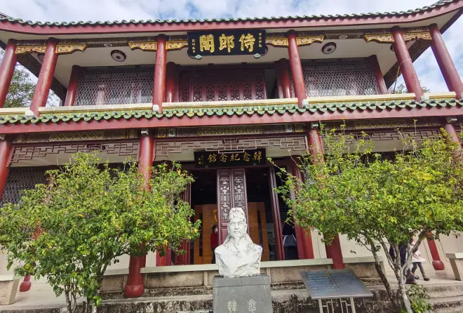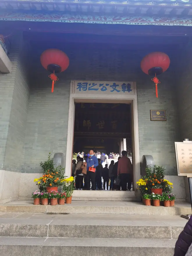 吃完饭骑着电动车往回赶,搜了一下发现韩文公祠在回去的路上并且不绕路,顺路去转了转,我们去的时候韩文公祠需要小程序预约,窗口不能购票。幸亏问了旁边的志愿者,志愿者指导我们买了票,不然就错过了。韩文公祠座落于韩江东岸、笔架山西麓,已有八百多年历史,是为了纪念韩愈而修建的,唐代元和十四年韩愈写了《谏迎佛骨表》,不料触怒了皇帝,被令处死,幸得宰相裴度等讲情,改贬为潮州刺史,以戴罪之身,在潮七个多月。他到了潮州后,发现潮州不仅地处偏僻,文化落后,而且农耕方式原始,学校不兴,陈规陋习甚多。一般说来,被贬谪的官员如同罪人,不会积极参政,韩愈却不然,新官上任三把火,大刀阔斧连续为百姓做了四件好事。一是驱除鳄鱼。潮州有一条江名为鳄溪,因为江里有很多鳄鱼,经常吃过江百姓,人们也称之“恶溪”。韩愈为驱除鳄鱼还写了一篇《祭鳄鱼文》。二是兴修水利,推广北方先进的耕作技术。三是赎放奴婢。下令奴婢可用工钱抵债,钱债相抵就给人自由,不抵者可用钱赎,以后不得蓄奴。四是兴办教育,请先生,建学校。韩愈之前,潮州只有进士3名,韩愈之后,到南宋时,登第进士就达172名,当属韩愈大兴教育之功。七个月后,韩愈徙袁州。但潮州百姓却把韩愈奉若神灵,七个月的潮州刺史,韩愈便使潮地的山山水水皆姓了韩,而且人多以韩为姓,街道、店铺、学校、树木也多以韩为名,祭鳄之地叫做“韩埔”,渡口叫做“韩渡”,将笔架山改称韩山,山下的鳄溪改称韩江,潮州的书院叫韩山书院。看得出来潮州人对韩愈的尊敬是发自内心的。韩公文祠重新修缮以后,好多领导人视察潮州时专门来韩公文祠参观并留字镌刻。我们怀着敬畏之心瞻仰并走过一代文豪的心路,韩公真乃一世文豪,治国大家,站在山上远眺,整个潮州一览无余。