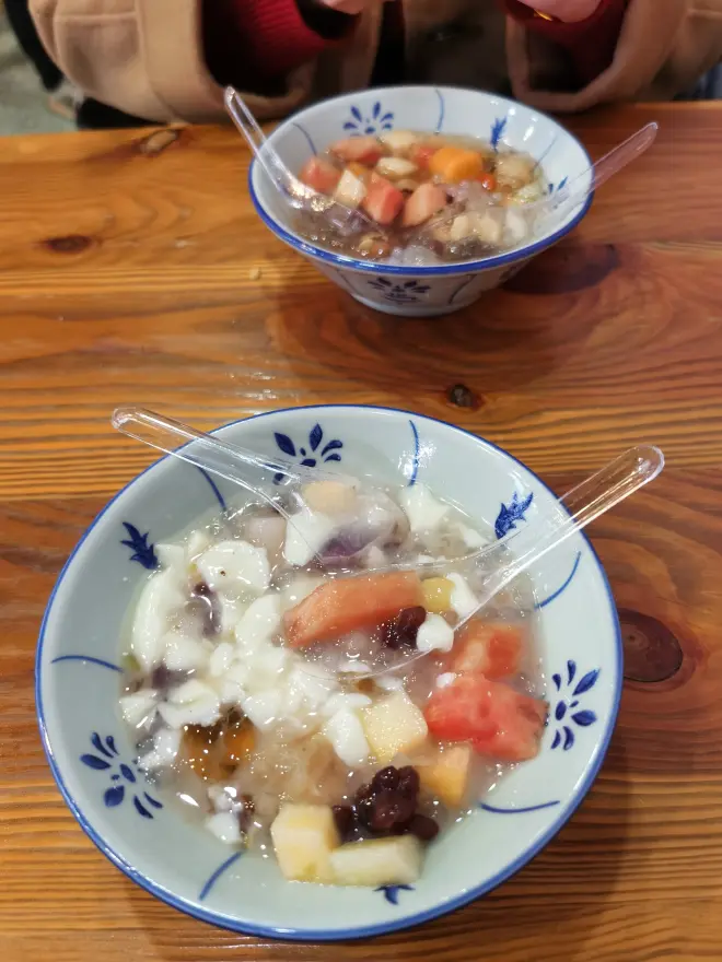 回宾馆睡了个午觉,下午在潮州古城逛了一下午,横竖胡同穿行,古城的牌坊街见证了潮州的名人,古城两侧店铺遍布特产店、牛肉丸店、特色小吃店,其中最多的是卖牛肉丸和潮州特产的。去牌坊街豆花买了一碗经典豆花一碗双皮奶,花了四十五块,结果上的是经典豆花和海石花的,由于懒得和店员沟通,没换,这家豆花非常一般,红蜜豆硬硬的,然后海石花里有龟苓膏的味道,应该是勺子混用了,古城里豆花店有好几家,不推荐这家;继续沿着古城游荡,遇到卖腐乳饼的老店胡荣泉,腐乳饼两块钱一块,买了两块,初尝还行,南乳和的馅料,吃了几口觉得有些腻口。