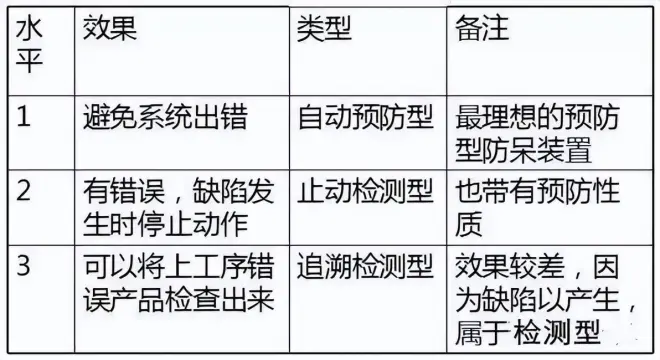 根据防呆装置的防呆效果,可将其分为3个水平: