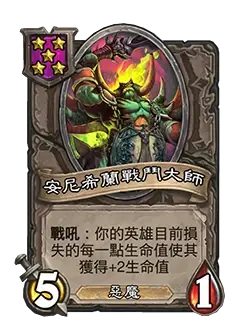 战吼:你的英雄目前损失的每一点生命值使其获得 +1 生命值。→战吼:你的英雄目前损失的每一点生命值使其获得 +2 生命值。