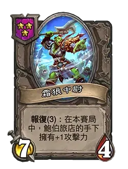 3星,中立。攻击力 4 点、生命值 7 点。报复 (2):在本赛局中,鲍伯的旅店中的手下获得 +1 生命值。