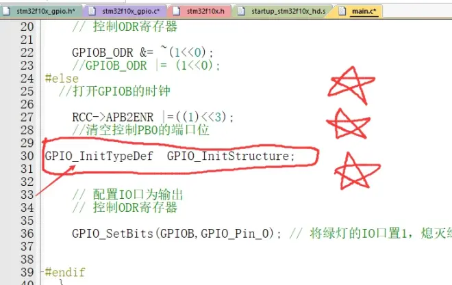 GPIO_InitTypeDef,这在C语言当中相当于这个结构体的名字。而在main函数中,它的后面加上GPIO_InitStructure的作用就是声明一个结构体,名字是GPIO_InitStructure。结构体原型由名字叫GPIO_InitTypeDef的结构体 确定。在之前的stm32f10x_gpio.h头文件里设置完了GPIO_InitStructure(里面的内容是GPIO_InitTypeDef的 )里面的内容后