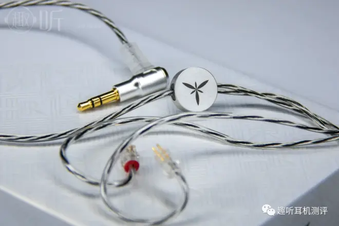 线材材质没有标明,在插头上依旧有水月雨经典的红圈盲点设计。这次的线皮是银色和黑色,最后互相缠绕在颜色上和兰很搭调,视觉一体感很不错。
