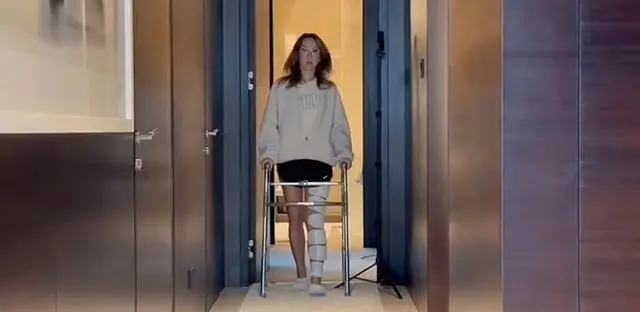 回家后李玟每天坚持做练习,自己扶着支架在豪宅走廊来回走,从远处看她有些瘦骨嶙峋,加上左腿贴满了绷带,看起来很孱弱,也令人心疼。