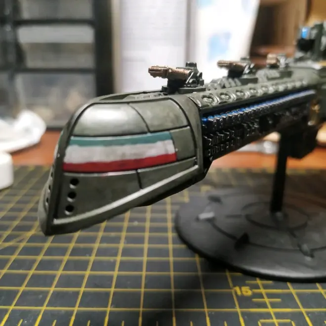 注解:这种单装的光矛威力和光矛炮塔上的双联装一致,一根抵得上一个炮塔(桌面规则上都是力量4),但它的射程只有光矛炮塔的四分之三(桌面规则上炮塔射程60cm,单装只有45cm),导致这武器是全船射程最近的玩意,这条战舰上的所有武器都能在60cm上开火(包括那些小型宏炮),就它不行,这配置真的太抽象了。
