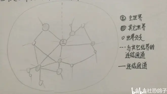 上图是大致的主世界与其他世界的概念图。 每个世界之间都有连接通道,有的只是个洞口,有的是列车,有的是奇异事件。连接方式各有不同,它们的出入口大部分处于界与界的边缘。 一个世界的产生各不相同。被正常创造出来、被撕裂后分化都有可能。这导致了各世界的环境、生物、核心都有巨大差异。世界与世界的通道有部分以一种难以形容的状态存在,也可以说是不稳定的传送途径。这是因为每个核心之间都有一些概念性的连接。(比如说的某句话触发了传送,或者概念性的藕断丝连)像列车等一系列人为打造的途径则不存在不稳定的说法。(但也有一定的安全隐患)