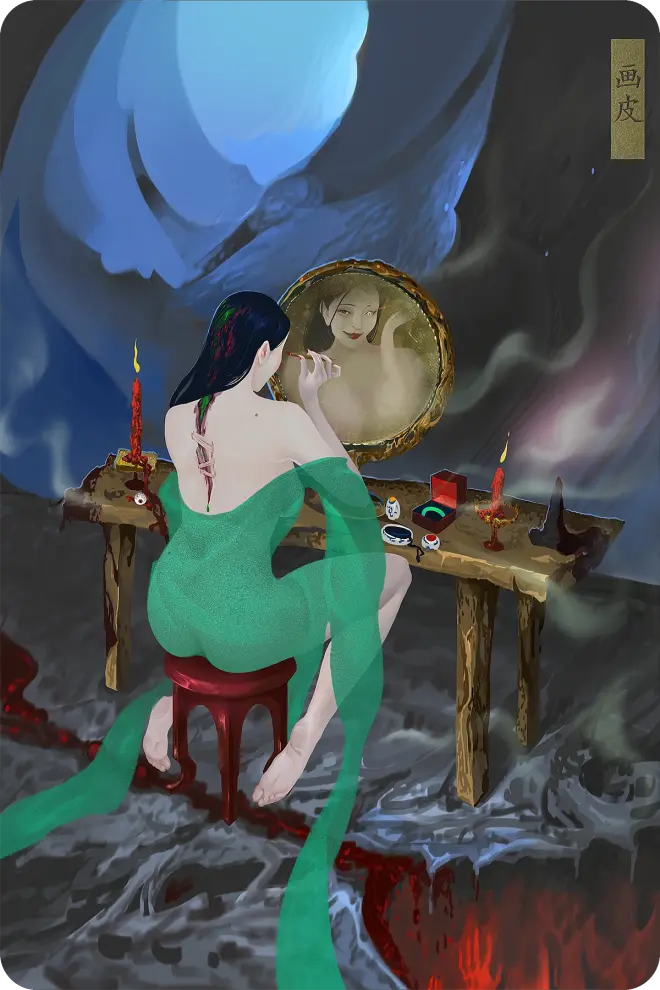 王生心里不快,出门在市上碰见一个道士,道士看到他后惊愕地问他:“你身上邪气环绕,莫非招了妖精鬼怪?”王生极力辩解否认。道士叹气说:“糊涂!世上竟有死期临头还不觉悟的人!”遗憾离去。王生因他话里有话,不得不怀疑阿草,一会儿功夫,王生就回到别院,推门,发现里边插着进不去,只好翻墙进了院子,但书房门依旧紧关着。他蹑手蹑脚走到窗前朝里面偷看,只见一个恶鬼,脸色青翠,尖牙嶙峋犹如锯齿。那鬼把一张人皮铺在床上,正拿着一支彩笔在上面描画着,很快就画好了,双手将人皮提起来披在身上,顷刻间变成了阿草,只是比之前更妖媚,头上还加了头饰、耳环。见此情景,王生吓得胆颤心惊,一声也不敢吭,像狗一样伏下身爬了出去,慌慌张张追上道士,扑通一声跪在地上哀求道士救命。道士说:“这鬼也怪可怜的,好不容易才找到一个替身,我也不忍心伤害它的性命,就帮你赶走它吧。”道士把蝇拂交给王生,叫他拿回去挂在卧室的门上,自然有用。