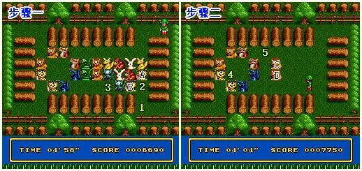 走到2的位置连续二次上踢;动物砖变成一个回字形。