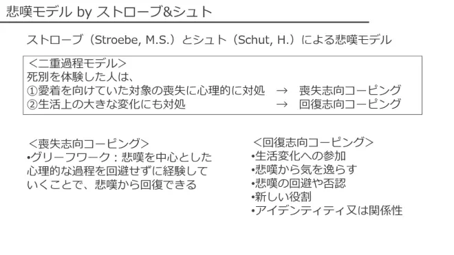 ストローブ(Stroebe, M.S.)とシュト(Schut, H.)による悲嘆のモデルでは、死別へのコーピングには喪失志向と回復志向の2種類があるとされる。
