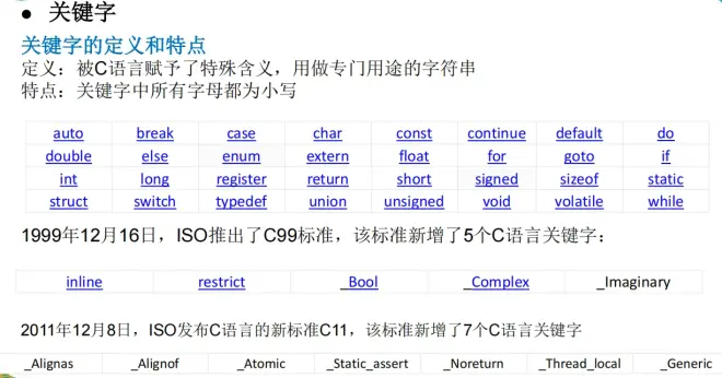 特点:关键字中所有字母都为小写,这句话没用(但C89是这样的)