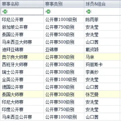 2023赛季上半年的比赛已经打完(中国台北公开赛忽略不计),今天统计的是女单的冠军。总共有13个公开赛,安洗莹和山口茜分别拿到5个和3个,占据一多半。其他球员各拿到1个