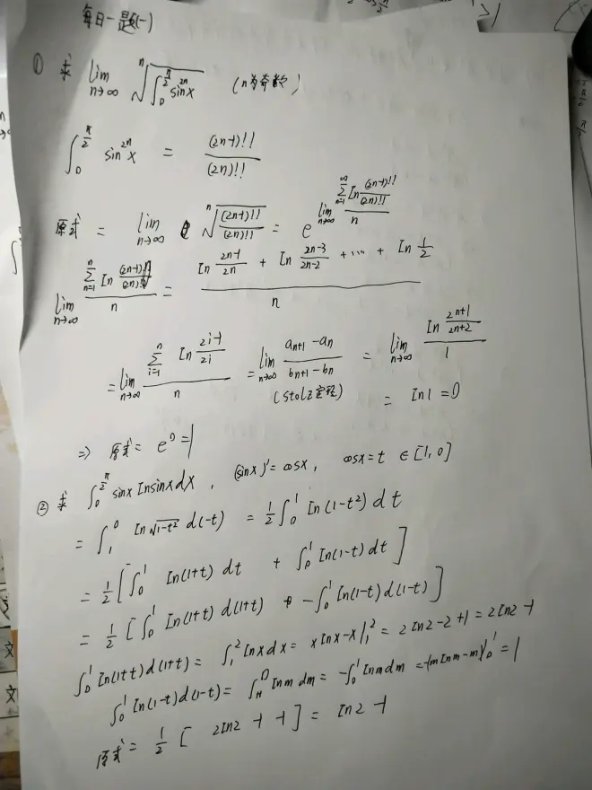 第一题利用取对数把求乘积转换为求和 再用stolz定理 第二题利用换元 dt等于dt+常数 求出最后答案