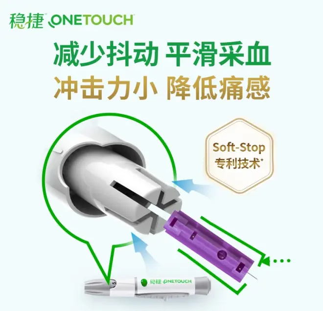 而且强生稳捷智优血糖仪(低痛款)搭配的是30G细小针头并应用了Soft-Stop专利防抖设计,采血痛感微乎其微,采血量也仅需芝麻粒大小的0.4微升,能够有效减轻糖友的心理负担。测糖时要注意,精准度和手指之间的关联并不大,但考虑到无名指、中指和小指平日里活动少、感染率低、疼痛轻,不影响日常生活,可以首选使用。