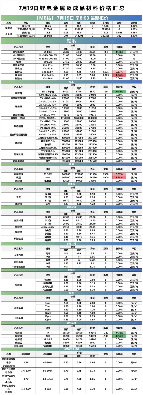 7月19日富宝锂电网锂电金属及成品材料价格: