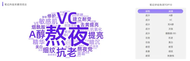 “ABC护肤公式”相关笔记内容中,“熬夜”、“熬夜党”高频出现,相关互动总量破700万,热度极高。挖掘更深层次的笔记信息,美白中的建立耐受、去黄提亮,抗老中的改善细纹成为热门内容趋势。