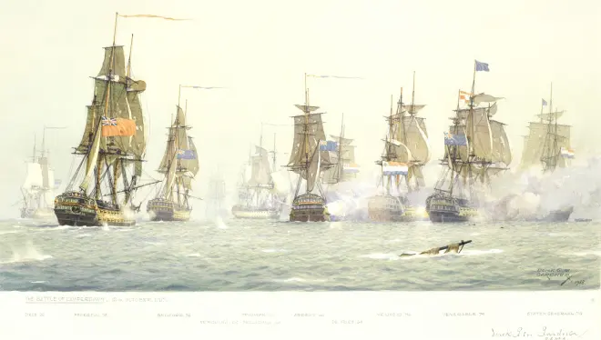 1797年10月11日坎珀当海战的一张绘画作品,此战之中,由亚当·邓肯海军上将指挥的英国海军北海舰队大胜由扬·德·温特海军中将所指挥的巴达维亚共和国海军舰队,未损一舰就俘获了11艘荷兰战舰(全歼了对面的一整个舰队)。