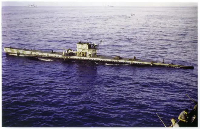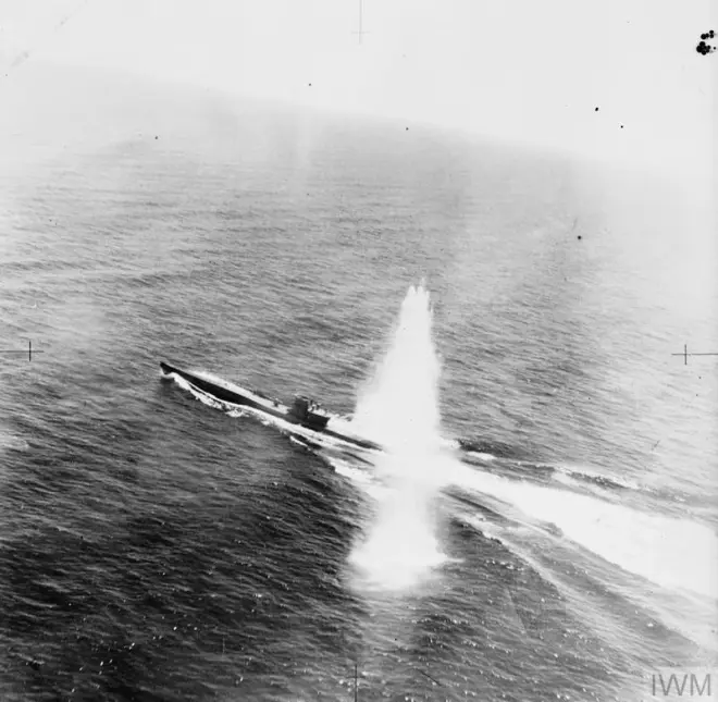 1943年5月28日,德国潜艇U-755在马略卡岛西北部遭到英国皇家空军第608中队的洛克希德哈德逊式轰炸机的攻击,该艇在照片拍摄9分钟后被击沉,40人阵亡