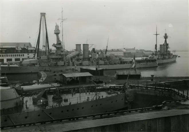 1933年,所有3艘瑞典级岸防舰一起停泊在卡尔斯克鲁纳海军造船厂。离镜头最近的是古斯塔夫 五世号,中间为瑞典号,右侧为维多利亚公主号