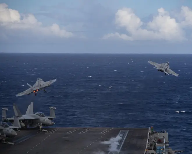 同时起飞两架超级大黄蜂的尼米兹号航空母舰