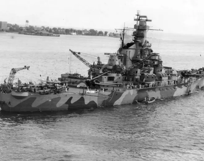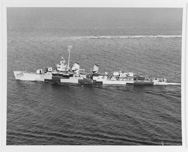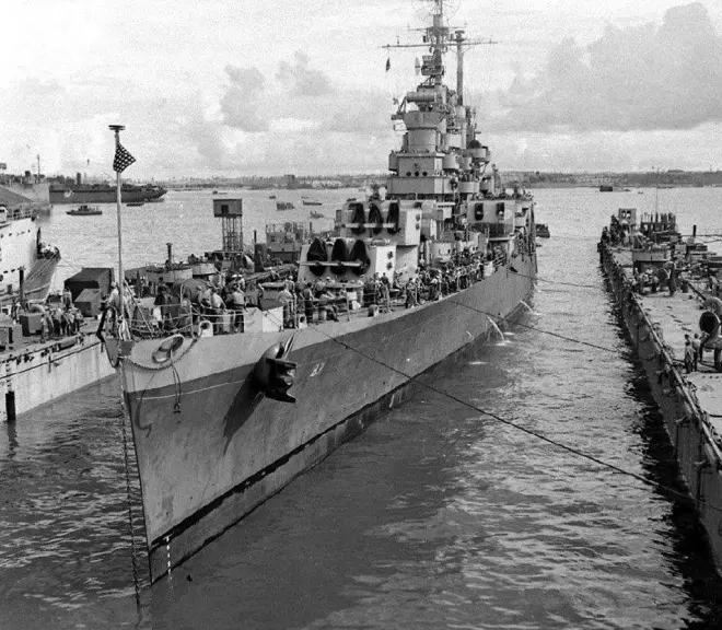 1945年,准备进入干船坞修理的美国海军代顿号轻巡洋舰