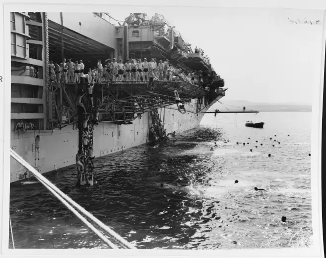 1950年5月27日,在西西里岛奥古斯塔,美国海军莱特号航空母舰的船员在航母的一侧游泳,使用她的一侧升降机作为跳水平台。