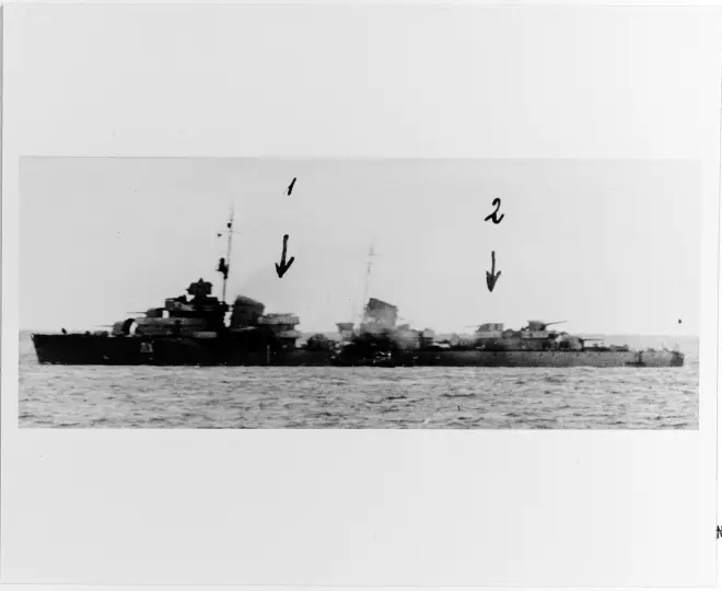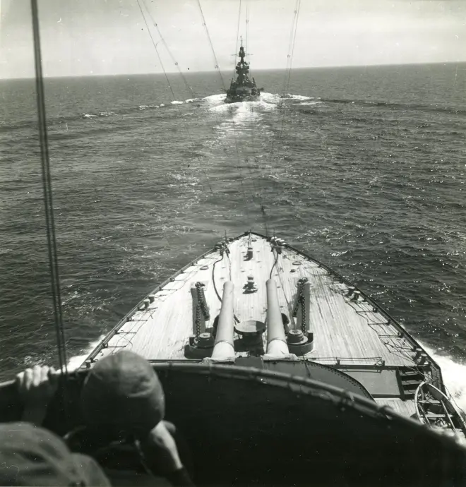 1942年2月22日,欧根亲王号重巡洋舰驶入挪威的格林施塔特峡湾。 远处,护航的驱逐舰是Z4理夏德·拜岑号。