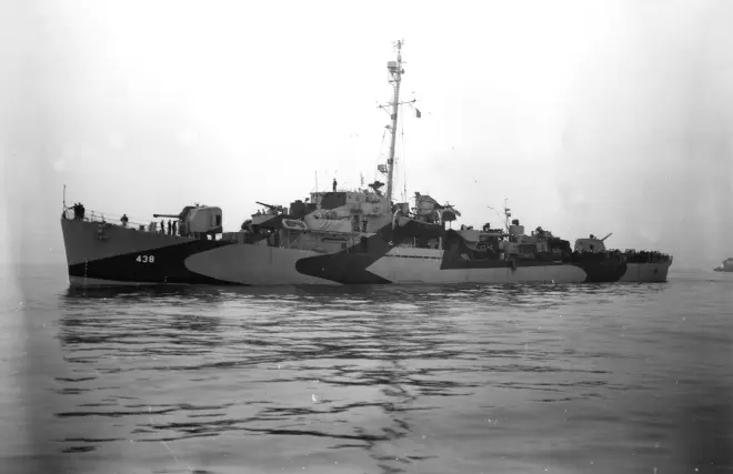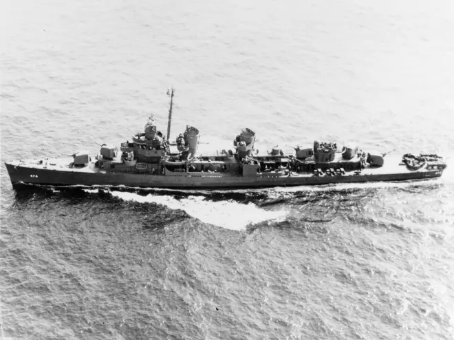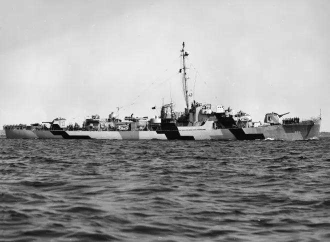 1944年6月8日,美国海军基伦号驱逐舰在华盛顿州里士满海滩附近航行。